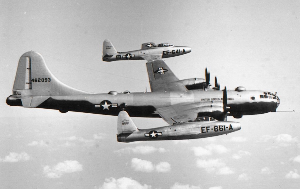 Fast-forward to the 1950s, and we find a rash of experiments involving so-called “parasite fighters” carried by long-range bombers. One scheme, fathered by the inventive ex-Blohm & Voss designer Richard Vogt, creator of the Ha 139, involved hooking fighters to a B-29’s wingtips to increase its span. The fighters had to navigate the white water of the B-29’s tip vortices to get clamped on, and, when attached, were hand-flown, using their elevators rather than ailerons for roll control. Apart from conceiving this idea, Vogt showed no other symptoms of insanity.