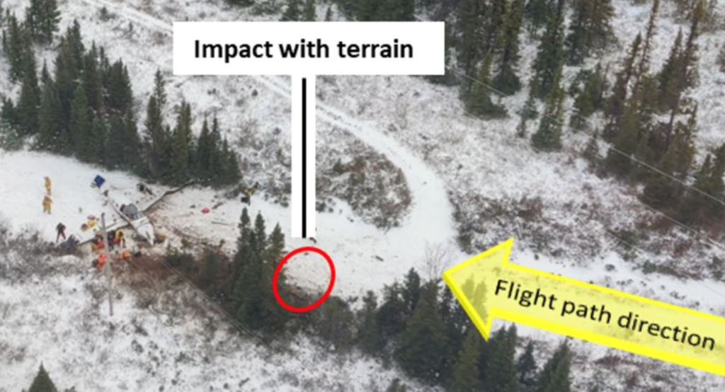Strike damage on trees indicates a final descent angle of 37° at a wings-level attitude and a low-speed loss of control.
