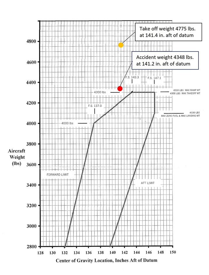 The actual takeoff weight was 4775 pounds and the CoG was 141.4 inches aft of datum. At the time of the accident the weight was 4348 pounds and the CoG was 141.2 inches aft of datum.