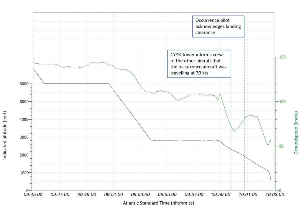 According to the ADS-B, at 0928, when the aircraft was about 85 NM from Goose Bay, it began a descent from flight level 230 and was cleared for the RNAV approach to runway 08.